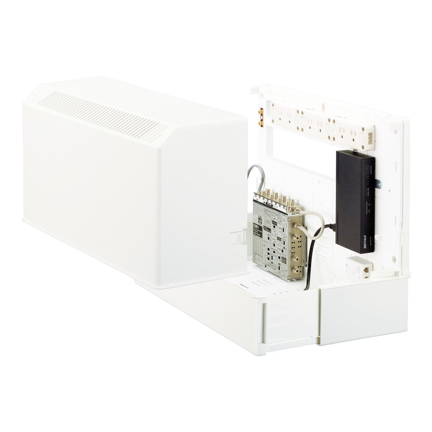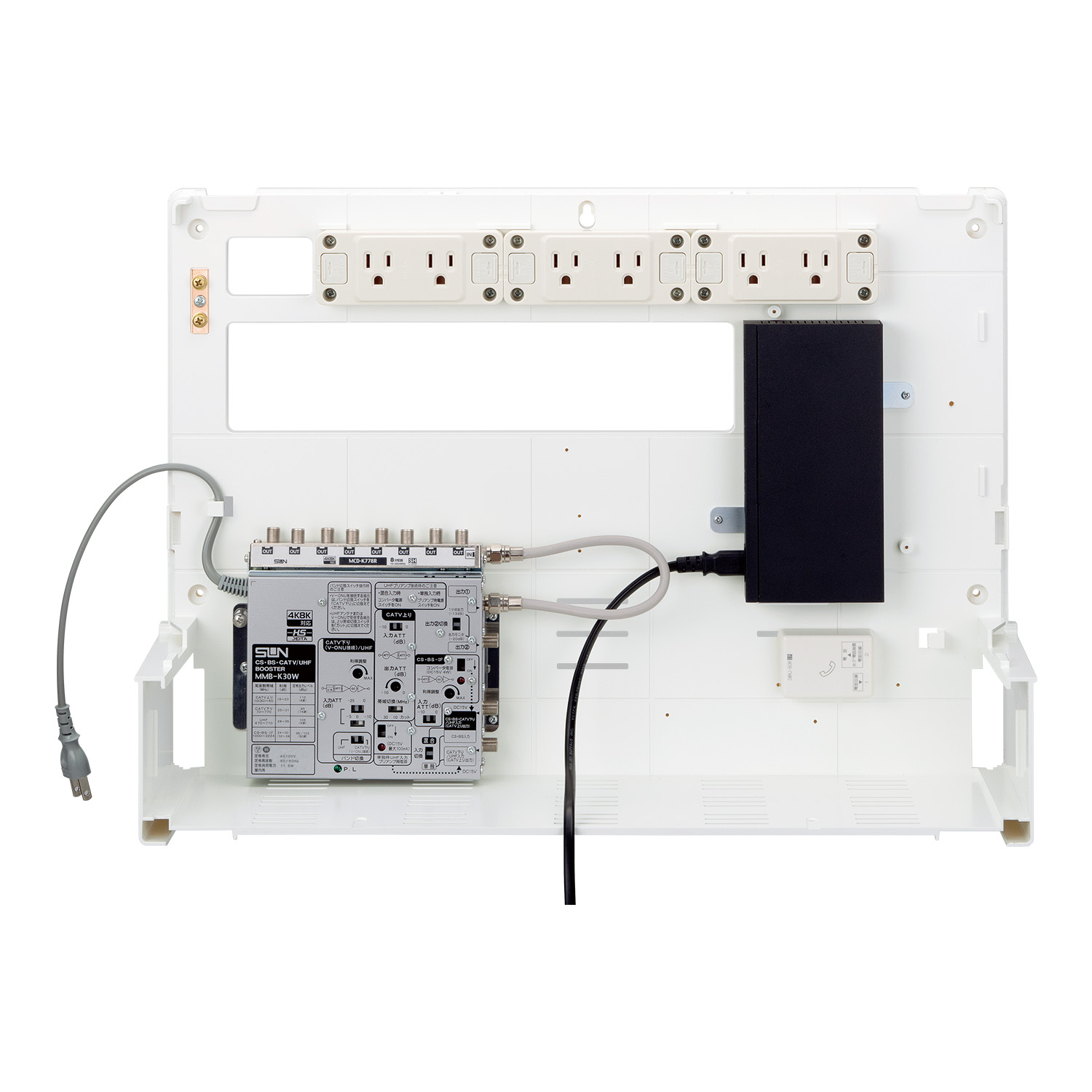 - インターネット、電話、テレビの配線を一つにまとめることができる、住宅用の情報分電盤です。