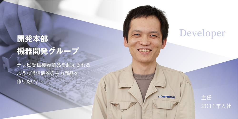 - 在学していた学内の企業説明会でサン電子のことを知り、その説明会でもともとは知らなかったテレビ受信機器など知り、少し興味を持ったことがきっかけになります。正直就職活動を行っていた時の当初からサン電子を知っていたわけでもありませんでした。ちょっとしたきっかけで興味を持ったことが入社した経緯になります。