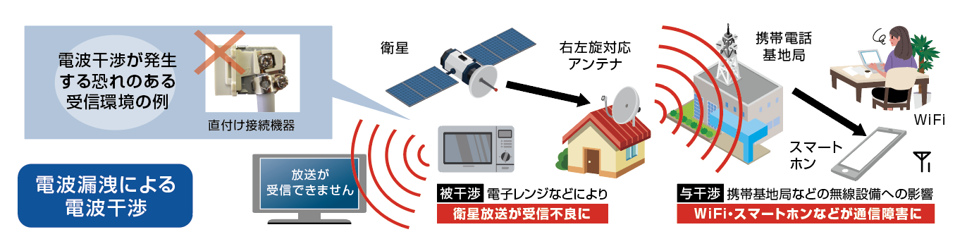 この電波が漏洩し既存のサービス・設備(無線LAN等)に干渉を与えることやテレビ受信機などが他の電波の影響で受信障害を受けることが懸念されています。そのため、2018年4月より漏洩基準を定める法改正が行なわれました。新たな左旋放送を受信する設備には、技術基準に適合した機器を使用する必要があります。