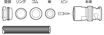 BNC形コネクタ6つのパーツ(本体、中心コンタクトピン、傘、ゴム、リング、受部)で構成されます。