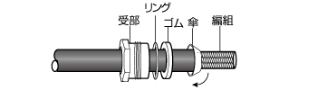 同軸ケーブルの外皮をカッターナイフで除去し、受部、リング、ゴムを通します。傘は外皮の付け根部の止まるところまで通します。