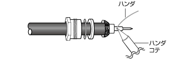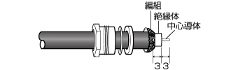 芯線3mm、絶縁体3mm、編組部を1mm出すよう加工します。編組は傘へ裏返します。