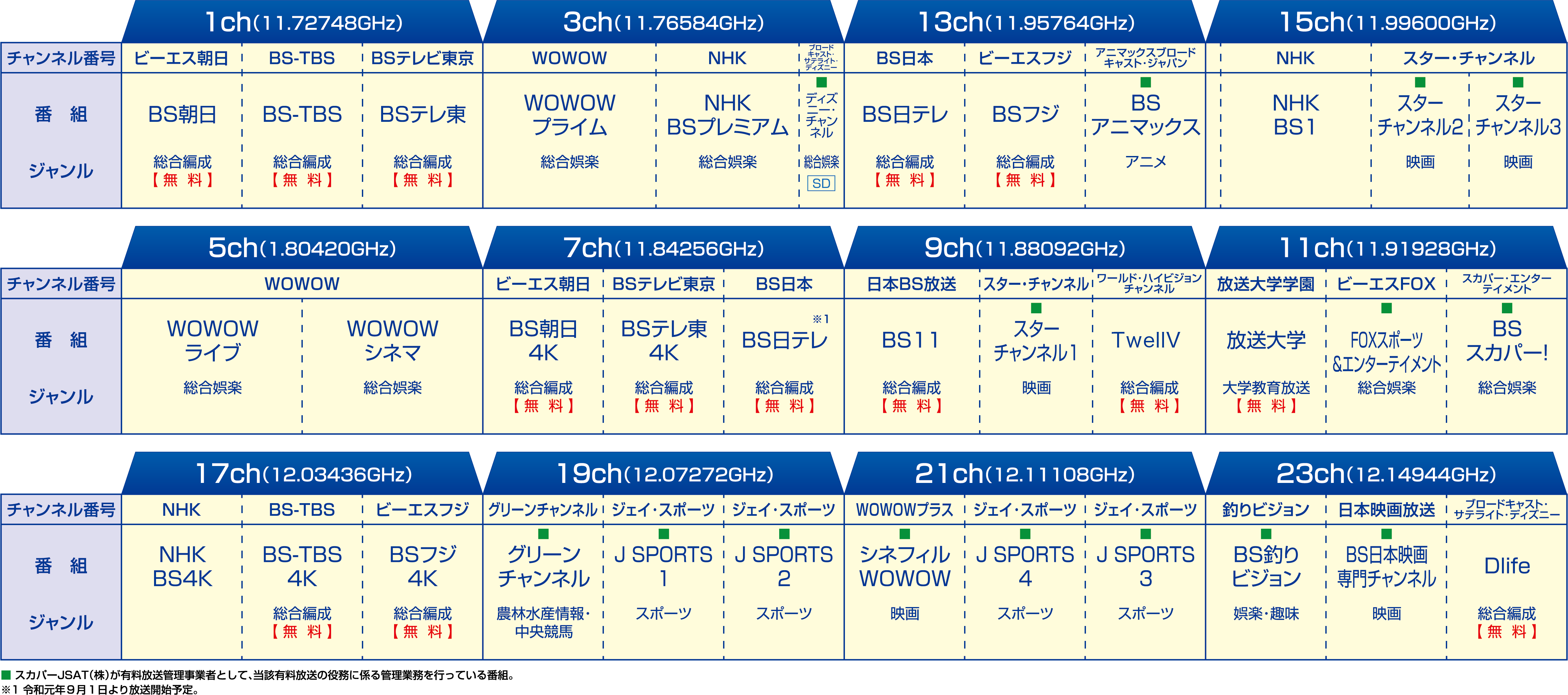BS放送の衛星トランスポンダ(送信機)は、1~23chの奇数チャンネル(1~23ch)の合計12チャンネルがあり、1チャンネルあたりHD番組なら2~3チャンネル分を放送することができます。 2018年4~6月にトランスポンダの移動作業が実施されました。帯域再編成後のチャンネル配置は以下のとおりです。