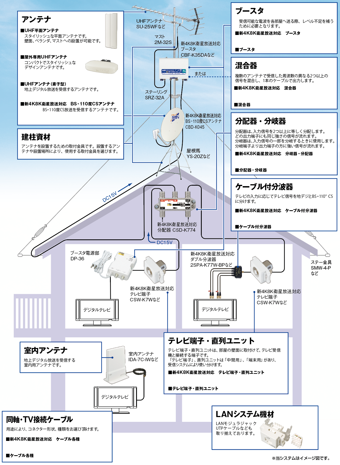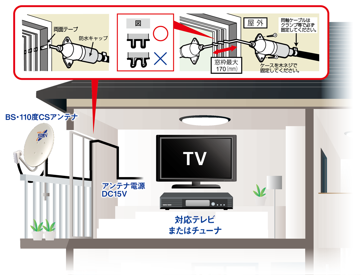 衛星アンテナを動作させる為に、テレビやレコーダ等からアンテナへ接続するケーブルを通じて「アンテナ電源(DC15V)」を供給する必要があります。