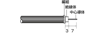図のように芯線を7mm、絶縁体部を3mm、編組部は短くカットします。