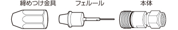 NF形(防水形)コネクタは3つのパーツ(本体、フェルール、締め付け金具)で構成されます。