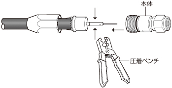 挿入後、中心コンタクトピンの太い部分を専用工具でかしめます。