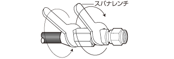 本体と締め付け金具部を手で回して仮締めし、最後にスパナを2つ使い、適度な力で増し締めします。
