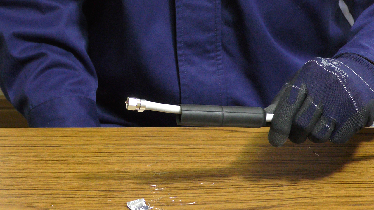 使用する同軸ケーブル(別売)に防水キャップ及びF-5接栓の加工を行います。F型コネクタ加工をした同軸ケーブルをアンテナ出力端子に適正トルク(約2N・m)にて締め付けてください。