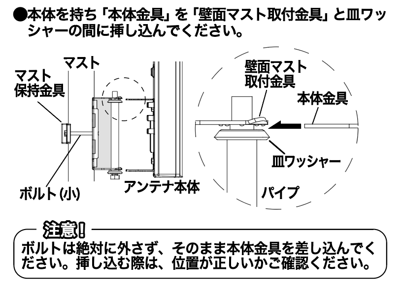 金具はのマストが地面に対して垂直になるように取付けて下さい。水平器をお使いになると便利です。垂直になっていませんと、調整作業の角度調整が正しく行なわれなくなります。