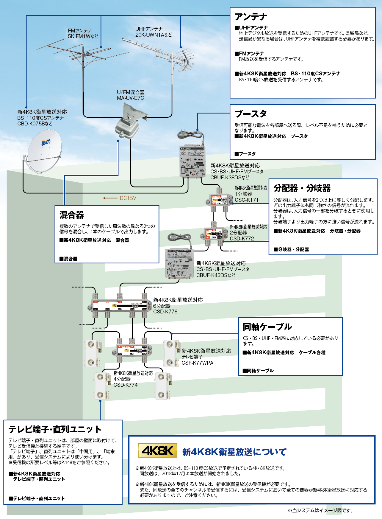 共同受信とは、ビルやマンションなどで、1つのアンテナで受信した電波をブースタや分配器、配線ケーブル(同軸ケーブル)、テレビ端子等を利用し、複数のテレビまで電波を伝送するための設備をいいます。分配器などで電波を分配すると電波量は減るため、分配する前に予め電波を増幅させるブースタを設置するなど、テレビ端子まで適正の電波レベルが確保できるよう設計、配線、機器の設置を行います。